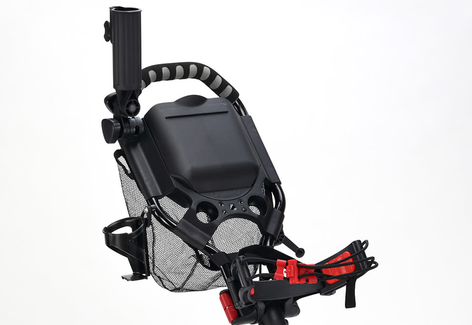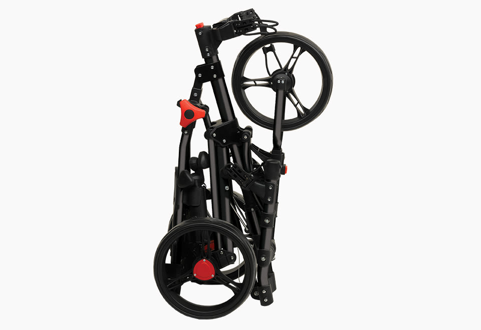 The Compact Golf Cart holds any size golf bag, yet folds up for easy transport and storage. Just press the EZ fold button to collapse and stow in a car trunk, shed or basement. Features a 360-degree front wheel, scorecard holder with storage compartment, beverage caddy, umbrella holder and mesh accessory pouch. The one-touch foot brake locks and unlocks the wheel without bending over. Some assembly required.