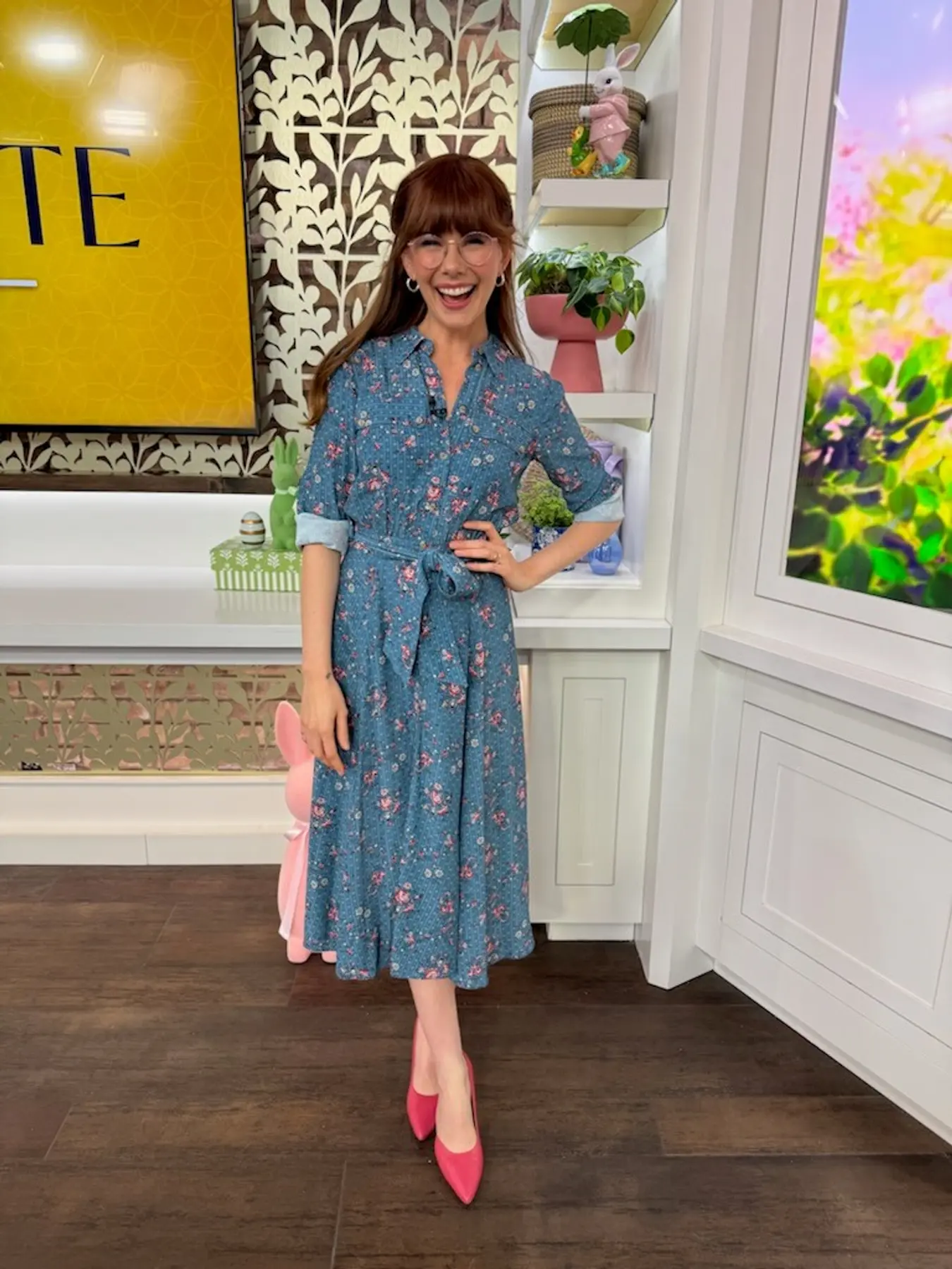 Long-sleeved midi dress Shirt collar and button front Removable belt to tie at waist Flowing A-line shape Patch pockets on chest