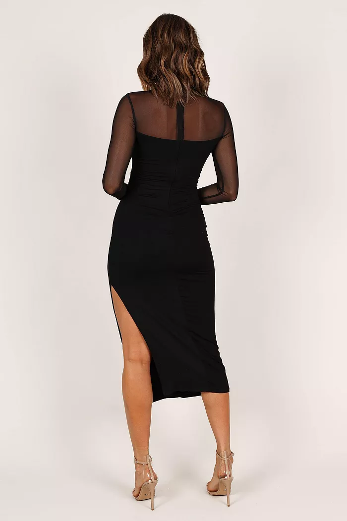 Make a statement in this midi featuring a mesh style top with cut out detail under bust, and front side split. Crafted from mid-stretch material, this dress is sure to turn heads at date night or your next party. Show off your unique style with the combination of flattering and flirty features.